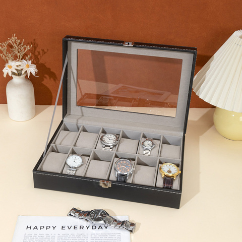 12 Slot Retro pelle PU scatola di visualizzazione orologio con grande finestra nera custodia per orologi